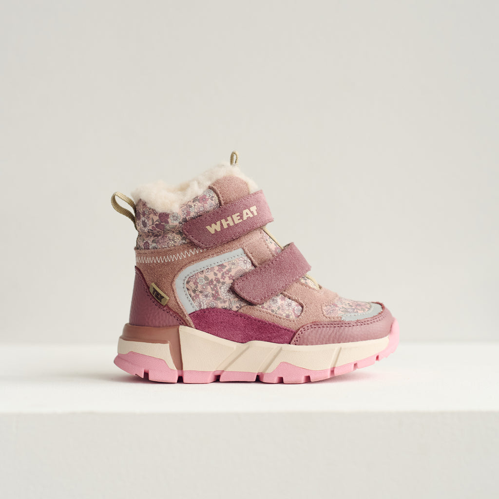Sportliche Winterstiefel mit doppeltem Klettverschluss für Ihr Kind.- Wollfutter- Tex-Membran - Zwei KlettverschlüsseDie Winterstiefel von Wheat haben ein angenehmes und warmes Wollfutter und sind für Ihr Kind einfach anzuziehen mit einem einfachen Verschluss. Die Stiefel haben eine Tex-Membran, die zu 100% atmungsaktiv und wasserdicht ist, was praktisch für den Herbst und Winter ist, da dies die kleinen Füße sowohl warm als auch trocken hält. Diese sportlichen Winterstiefel haben einen hohen Schaft und zwei Klettverschlüsse über dem Fuß für eine einfache Anwendung und Anpassung. Die Winterstiefel bestehen aus einer Kombination aus LWG-zertifiziertem Leder und Blumen bedrucktem Nylon.Die Stiefel haben ein Wollfutter sowie eine herausnehmbare Innensohle aus Latex, die mit Wolle überzogen ist, weshalb diese Stiefel perfekt als Winterstiefel sind, da sie sowohl unterstützend als auch warm sind. Latex ist ein natürliches Produkt, das atmungsaktiv und flexibel ist und einen Trampolin-Effekt für bequemere Schritte bietet. Die Stiefel haben eine Gummilaufsohle mit guter Traktion und Flexibilität. Es ist normal in der Größe mit einem festen Halt am Fuß Ihres Kindes. Empfohlene Wachstumsmöglichkeit: 1-1,5 cmInnenmaß:Größe 24 = 16,1 cmGröße 25 = 16,8 cmGröße 26 = 17,5 cmGröße 27 = 18,1 cmGröße 28 = 18,8 cmGröße 29 = 19,4 cmGröße 30 = 20,1 cmGröße 31 = 20,8 cmGröße 32 = 21,4 cmGröße 33 = 22,1 cmGröße 34 = 22,7 cmGröße 35 = 23,4 cm