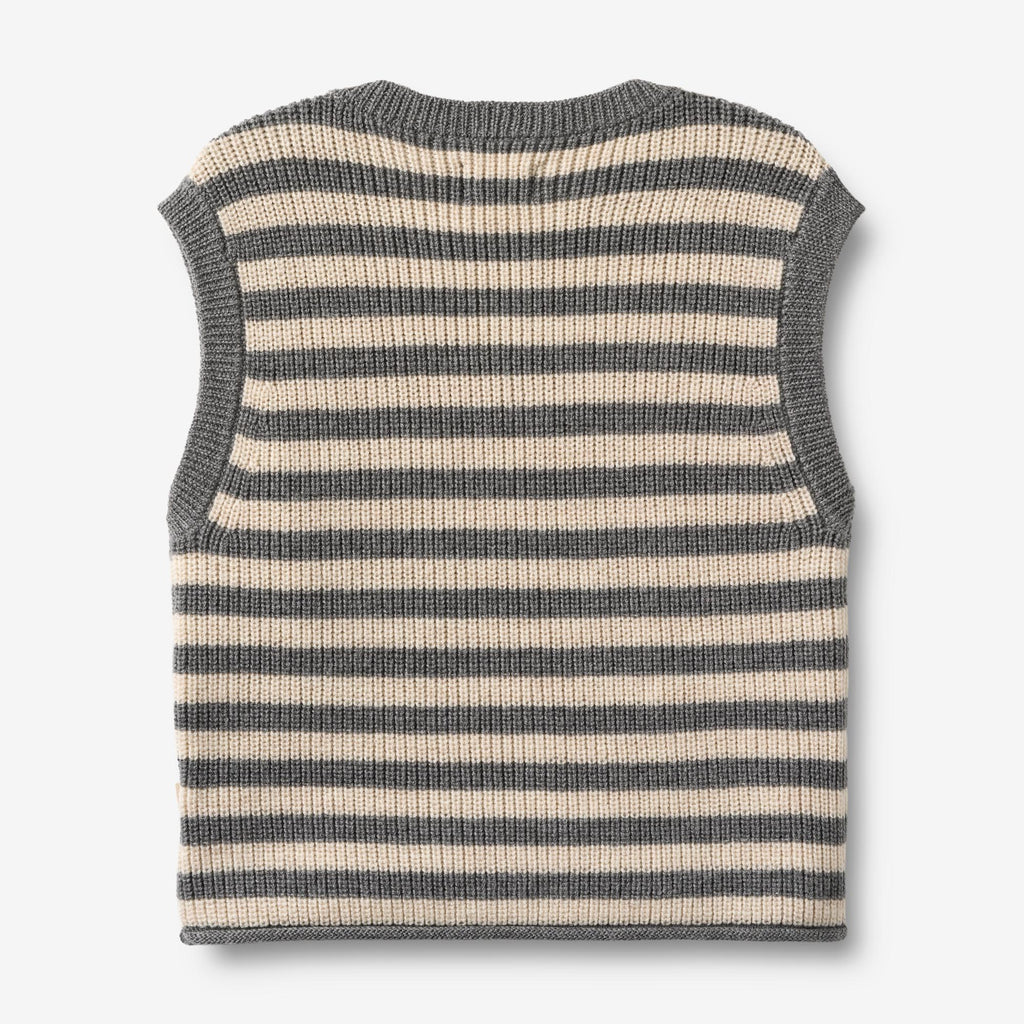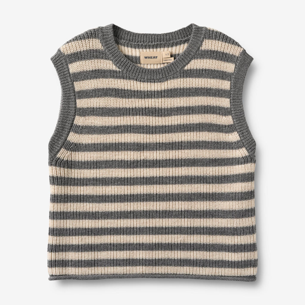Strickweste mit Streifen aus weicher Merinowolle für Kinder.- Lockerer Schnitt- Überschnittene Schultern und weite Armausschnitte- Rippbündchen an Ausschnitt, Ärmelausschnitten und Saum- GestreiftWheats Strickmode ist ein unverzichtbarer Begleiter für die kalten Herbst- und Wintermonate. Sie ist besonders weich, angenehm zu tragen und kratzt nicht. Unsere Strickwaren haben einen klassischen Look mit einer entspannten Passform, die sich mühelos kombinieren lässt. Die Weste eignet sich perfekt als zusätzliche Schicht an kühlen Tagen und kann sowohl über einem Hemd als auch über einem Kleid für besondere Anlässe getragen werden.