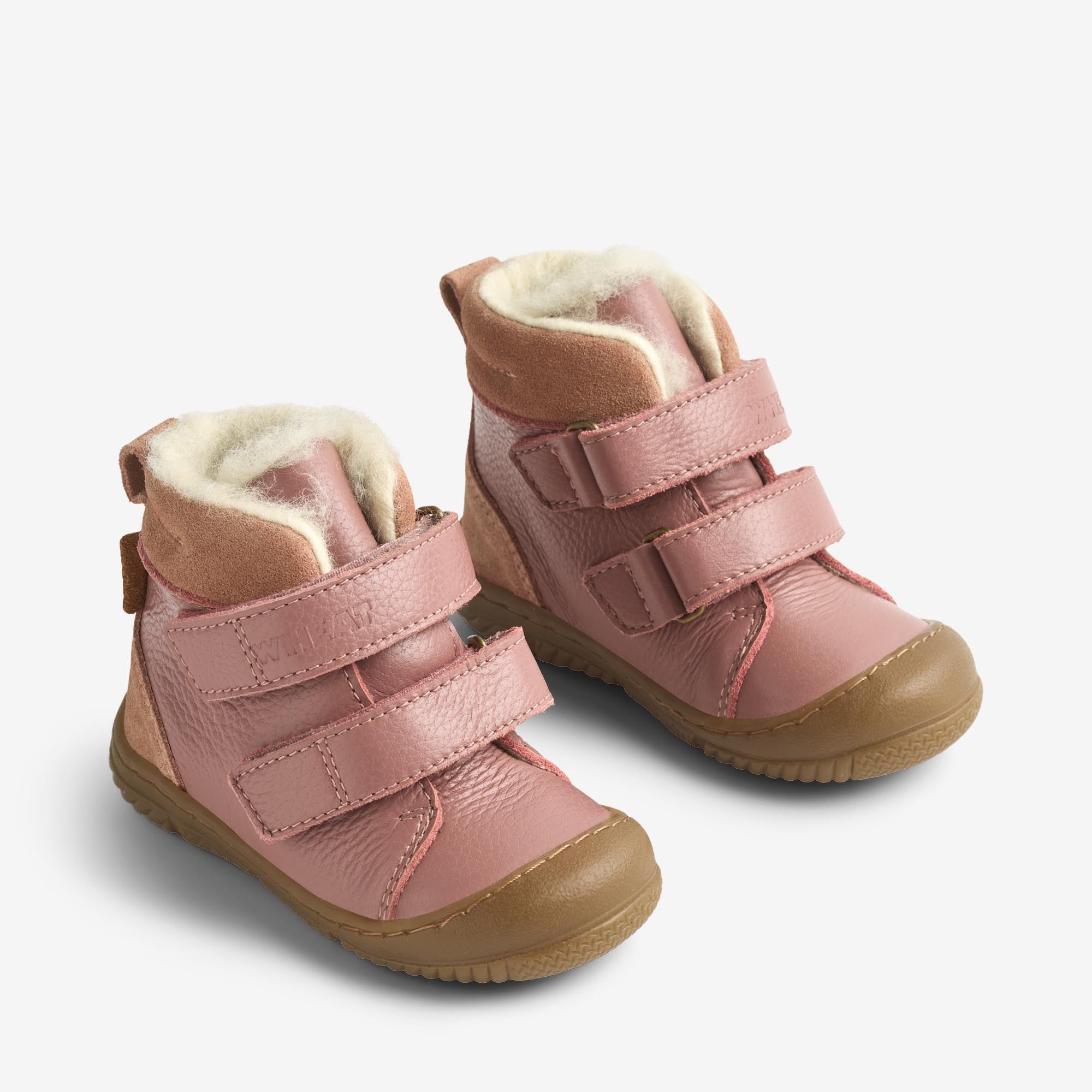 Das Modell fällt klein aus, im Zweifelsfall empfehlen wir, eine Nummer größer zu wählen.Bequeme Pre-Walker mit doppeltem Klettverschluss für dein Kleinkind.- Futter aus Wolle- Tex-Membran- Zwei KlettverschlussriemenDie Lauflernschuhe von Wheat sind leicht, flexibel und bequem für dein Kind und schützen die kleinen Füße, wenn sie sich auf ihre ersten Abenteuer begeben. Dieser Schuh hat einen doppelten Klettverschluss, der das Hineinschlüpfen erleichtert, und ist für die perfekte Passform vollständig verstellbar.ie Stiefel sind mit einer Tex-Membran ausgestattet, die zu 100% atmungsaktiv und wasserdicht ist und den Füßen Ihres Kindes während der Herbst- und Wintermonate hervorragenden Schutz bietet. Bei längerem Aufenthalt in sehr nassen Bedingungen kann jedoch mit der Zeit Feuchtigkeit eindringen. Für längere Aufenthalte in sehr feuchten Umgebungen empfehlen wir unsere Winter-Gummistiefel.Das Material ist sehr langlebig und bekommt mit der Zeit eine wunderbare Patina. Als hübsches Detail haben die Stiefel Wildlederdetails oben am Schaft und an der Ferse.Die Sohle ist mit einer Latexeinlage versehen, die mit Wolle überzogen ist. Deshalb sind diese Stiefel perfekt als Winterstiefel geeignet, da sie sowohl stützend als auch warm sind. Latex ist ein natürliches Produkt, das atmungsaktiv und flexibel ist und mit etwas Dämpfung für bequemes Laufen sorgt.Die Laufsohle besteht aus Gummi, das sehr leicht ist und eine gute Traktion und Flexibilität bietet. Sie ist so konzipiert, dass sie über die Zehen verläuft, um zusätzlichen Schutz zu bieten.Empfohlener Wachstumsspielraum: 1-1,5 cmInnenmaß:Größe 19 = 12,3 cmGröße 20 = 13 cmGröße 21 = 13,7 cmGröße 22 = 14,2 cmGröße 23 = 14,9 cmGröße 24 = 15,8 cmGröße 25 = 16,4 cmGröße 26 = 17 cm