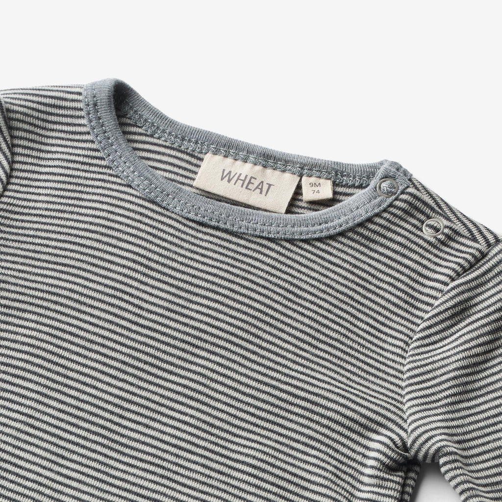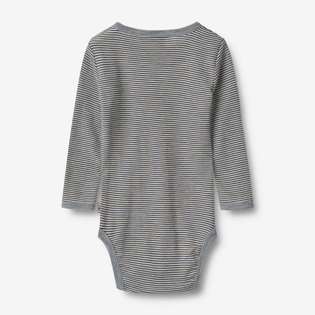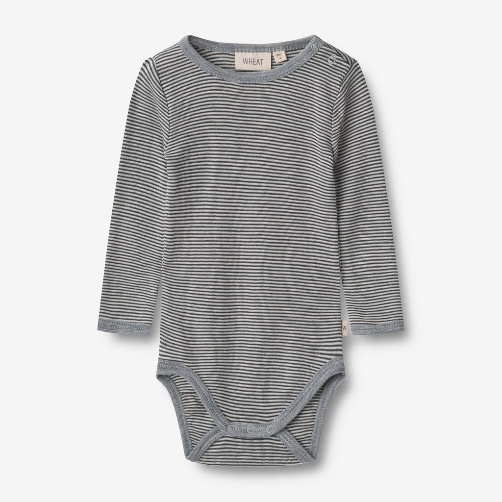 Niedlicher Langarm-Body aus weichem Merinowoll-Jersey für Ihr Baby. - Reguläre Passform- Druckknöpfe an Schulter und Schritt- gestreiftDie Wollkleidung von Wheat ist speziell entwickelt, um Ihr Kind warm zu halten, während es gleichzeitig verhindert, dass es überhitzt, da Wolle die einzigartige Eigenschaft hat, die Körpertemperatur zu regulieren. Die Wollstyles eignen sich hervorragend zum Schichten und sind sanft zur nackten Haut.Wheats Body ist unisex und ein unverzichtbares Kleidungsstück im Kleiderschrank Ihres Babys, da es alleine getragen oder als zusätzliche Schicht unter Alltagskleidung getragen werden kann. Die Bodys haben entweder Druckknöpfe an der Schulter oder Knöpfe am Hals für besseren Komfort beim Anziehen Ihres Babys. Der Body hat auch Druckknöpfe unten, was es Ihnen erleichtert, auf die Windel Ihres Babys zuzugreifen.